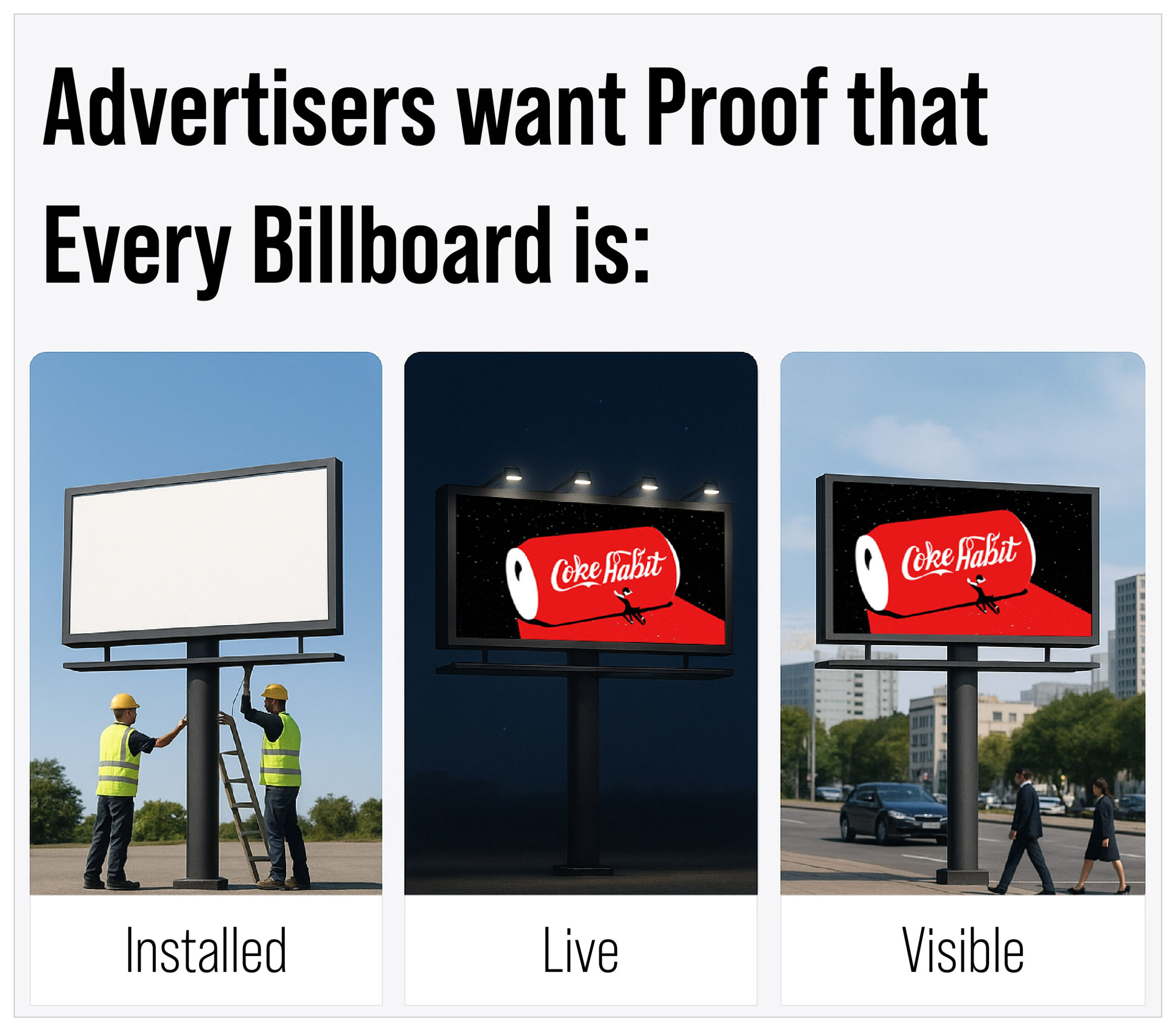 We have been in this business for over a decade now, and we have seen firsthand why verification is critical. In fact, in many campaigns, more than 50% of sites are either not installed, damaged, removed before time, or simply not located where they were promised. That means wasted ad spend, broken brand visibility, and inconsistent messaging that hurts brand image.